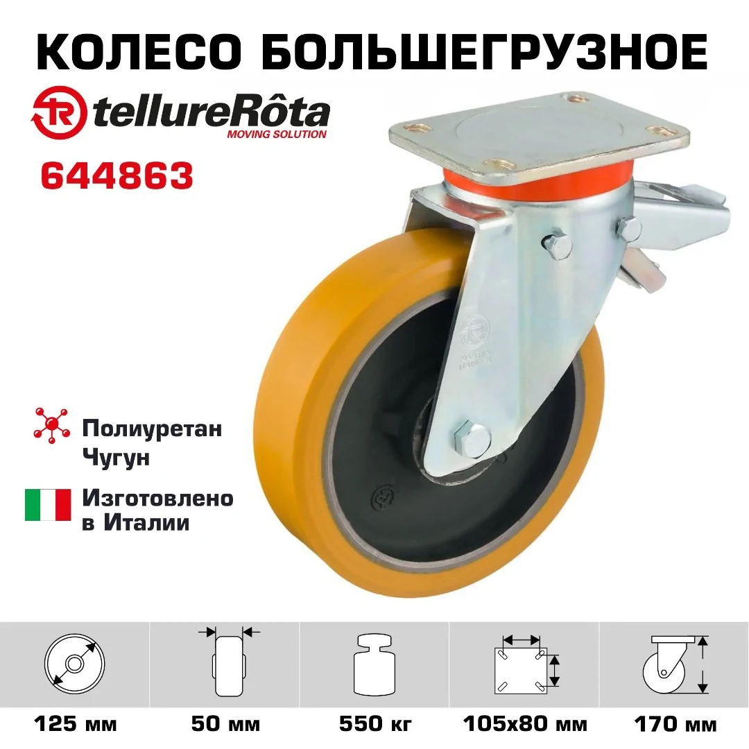 Колесо большегрузное полиуретановое поворотное 125 мм Tellure Rota 647863, нагрузка 550 кг, чугунное