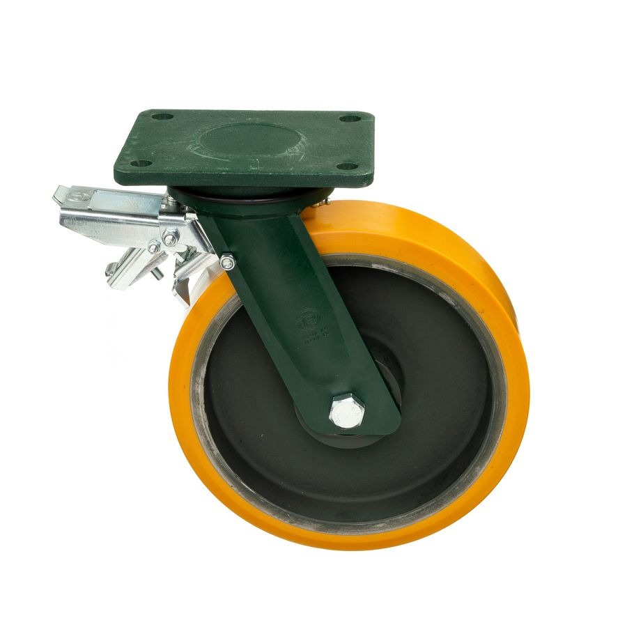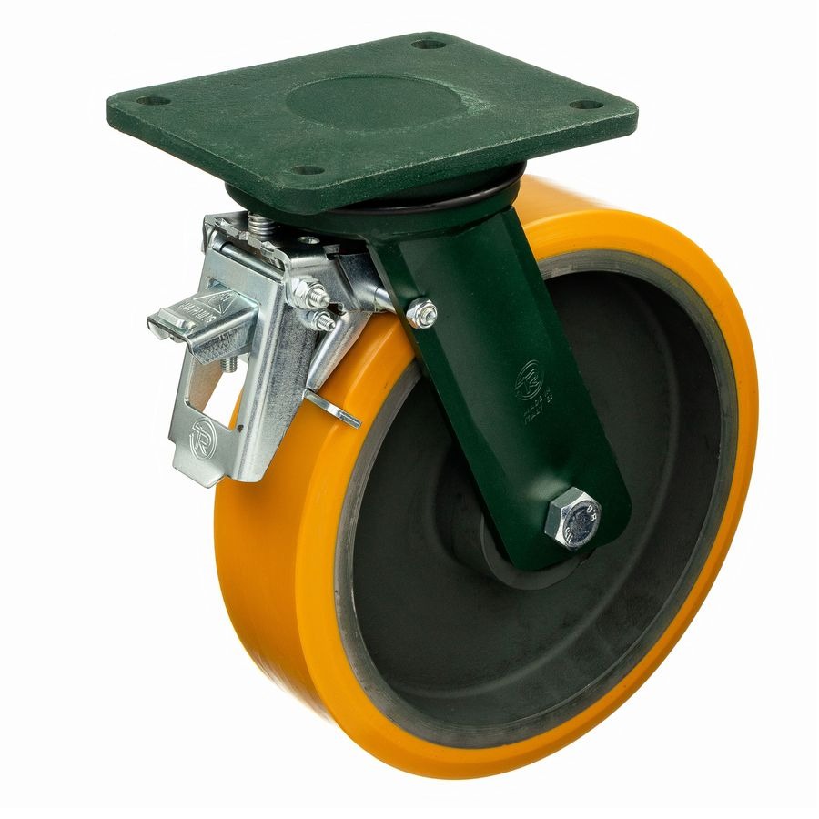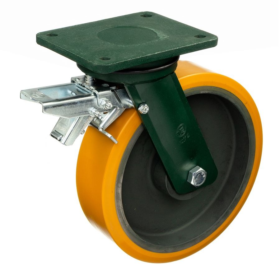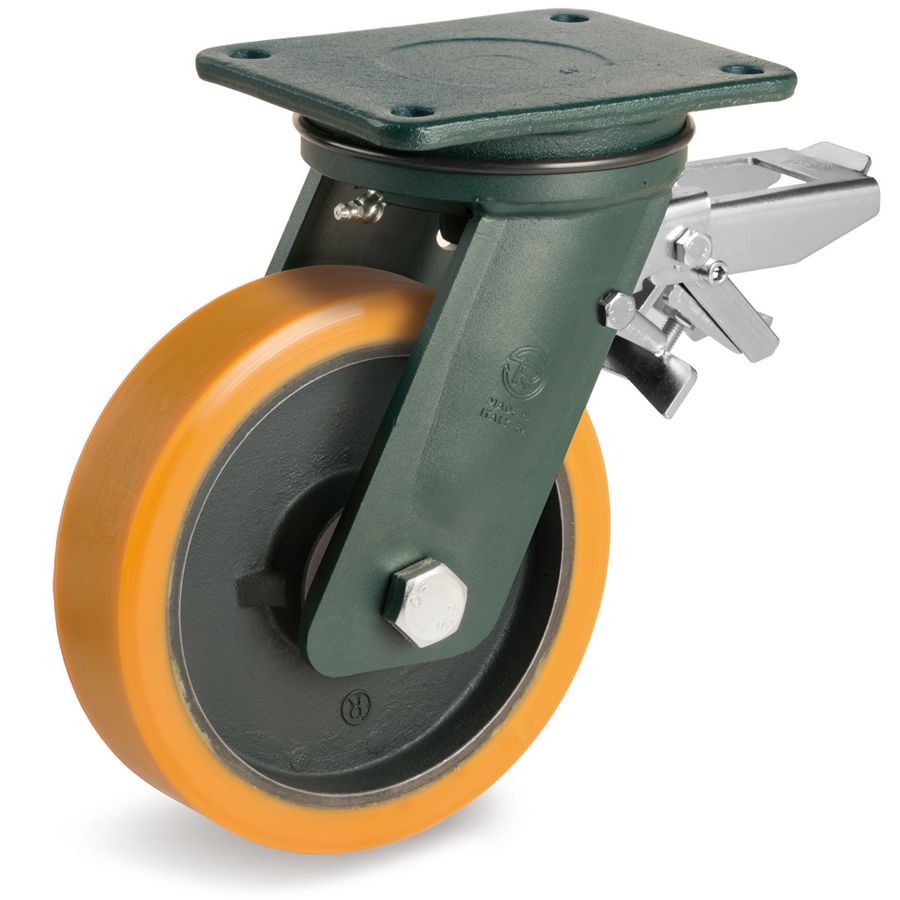 Колесо большегрузное полиуретановое поворотное с тормозом Tellure Rota 648516 диаметр 200 мм, нагрузка 1600 кг, чугунное