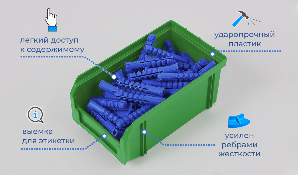 Лотки открытого типа V-1 из удароустойчивого пластика идеально подходят для хранения метизов, инструмента, комплектующих, запасных частей и других мелких предметов.
