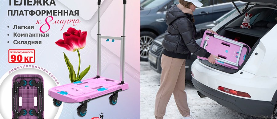 В преддверии Международного Женского Дня дарим 50% скидку на складную хозяйственную тележку в нежно-лиловом цвете FF-XS-Rose! Легкая как перышко, тележка, однако, перевозит грузы до 90 кг! Отличный стильный подарок к 8 марта, когда хочешь позаботиться о любимых. В складном состоянии не занимает много места, легко поместится в багажнике машины.
